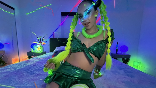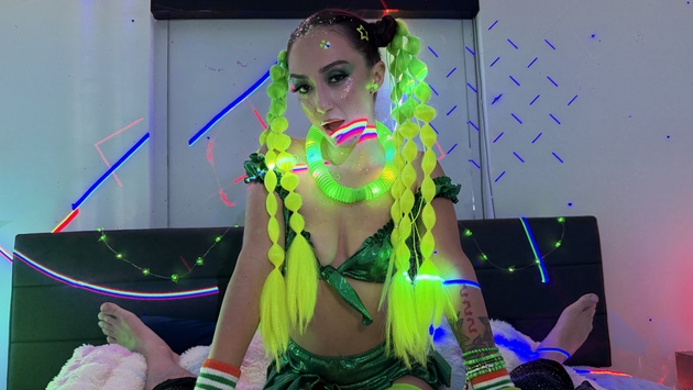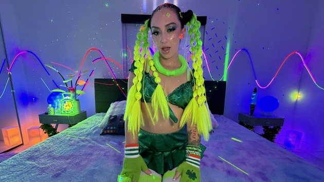 This web site contains sexually explicit material:In Brian Omally’s neon-soaked St. Paddy’s fuck pad, petite Latina spinner Lily Jordan turned her glowing shamrock outfit into pure fuckbait after abandoning her rave date. With lasers flashing across her glittery skin and neon-green pigtails flying, she spread wide on the bed and fingered her hairy cunt before clamping the pink vibrator tight, shaking and dripping until Brian offered his beats and his cock. Two deep, gagging blowjobs synced perfectly with the bass drops while he devoured her pussy, then she rode him cowgirl like a true lucky charm until the first creampie flooded her. Round two exploded with reverse cowgirl grinding under blacklights, doggy railing her perfect ass, missionary pounding, and spooning side-fucking that ended with a second thick load pouring out like a pot of gold.
