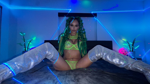 This web site contains sexually explicit material:Laser lights slash and bass throbs as Armani slips away from the packed rave floor with Brian for a lightning-fast quickie. Neon green fishnets cling tight, glitter green pasties sparkle on her tits, neon green extensions sway wild, sweat fresh from dancing. Minutes till his next set, no time to lose. She grinds quick, peels fishnets aside, drops to knees and slurps him sloppy and fast, syncing to the distant pulse. Brian grips her tits, pasties shifting for a slick titfuck, fingers her till she quivers. He bends her over, slams in deep doggy through the mesh and pounds hard, flips for frantic missionary as extensions whip. Moans spike over the hi-hats. He pulls out, unloads thick ropes across mouth, chin, tits and pasties. Blacklight glow ready. Armani wipes her lips, grins, and heads straight back to the rave cum-drenched and loving it.
