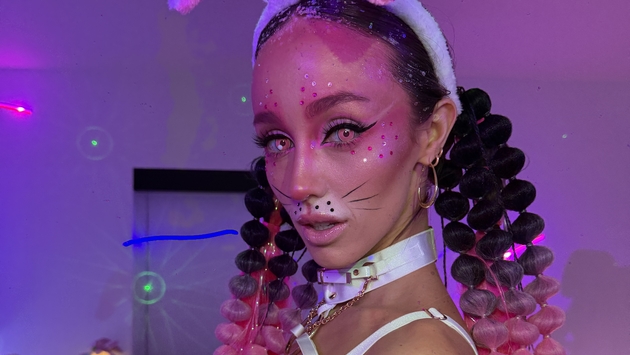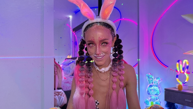 This web site contains sexually explicit material:Christina Sage bounces into Brians neon soaked den wearing pastel bunny ears and a glitter covered rave outfit ready to make Easter filthy. Lasers flash pink and blue across her body while she spreads wide on the bed fingering herself before Brian dives face first into her dripping pussy eating her until shes shaking. She returns the favor wrapping her lips around his cock gagging deep while the bass thumps then climbs on top riding him cowgirl style bunny ears bouncing with every thrust. He flips her over pounding missionary until he floods her with a thick Easter creampie that drips out like melted chocolate.